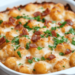 A hearty and comforting casserole featuring chicken, bacon, ranch dressing, and crispy tater tots. Perfect for a family dinner!