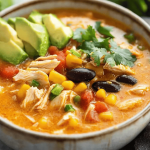- Ladle the soup into bowls. Garnish with shredded Monterey Jack cheese, chopped cilantro, tortilla strips, diced avocado, and a dollop of sour cream or Greek yogurt. Serve with lime wedges.
