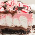A delightful layered dessert with a chocolate cookie crust, creamy peppermint filling, and whipped topping, perfect for the holidays!