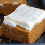 - Spread the cream cheese frosting evenly over the cooled pumpkin bars.