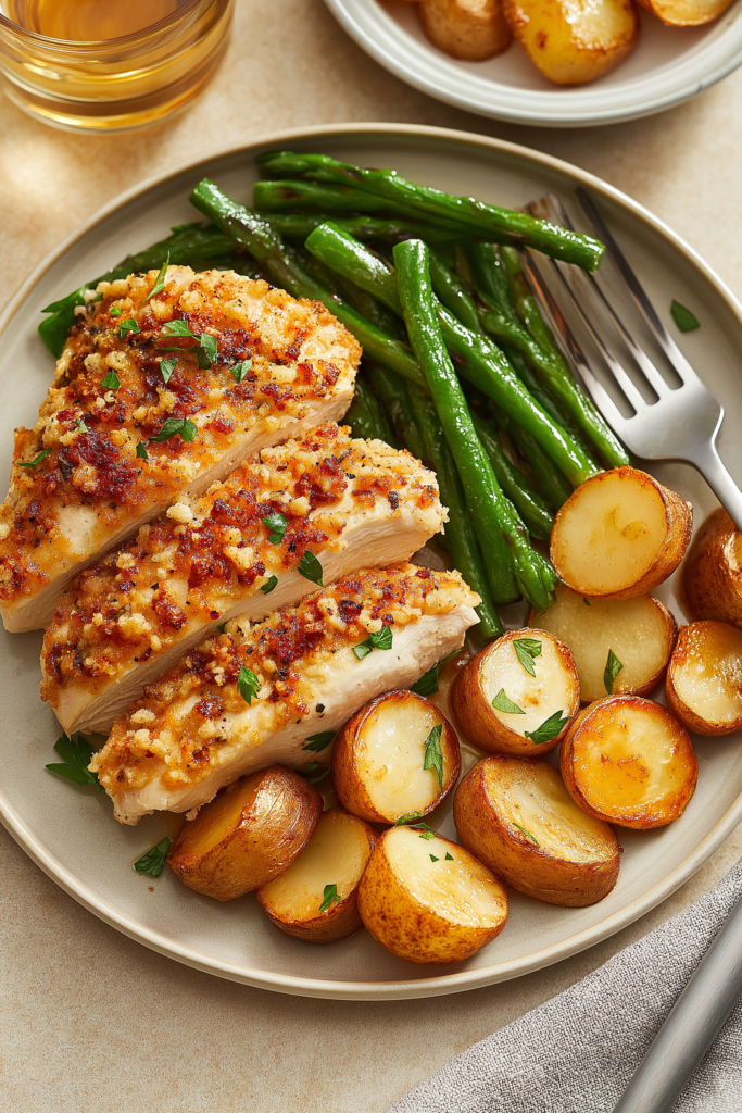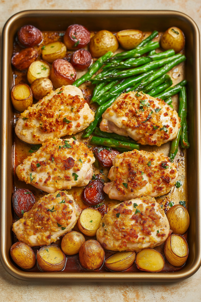 This Parmesan Crusted Chicken Sheet Pan Dinner is a weeknight hero—juicy chicken breasts coated in a crispy, cheesy parmesan crust, roasted alongside tender vegetables all on one pan. It’s simple to prep, easy to clean, and packed with bold, savory flavors. Perfect for busy nights when you want something healthy, hearty, and satisfying with minimal effort.
