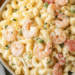 A creamy and flavorful macaroni salad loaded with succulent shrimp, perfect for any occasion.