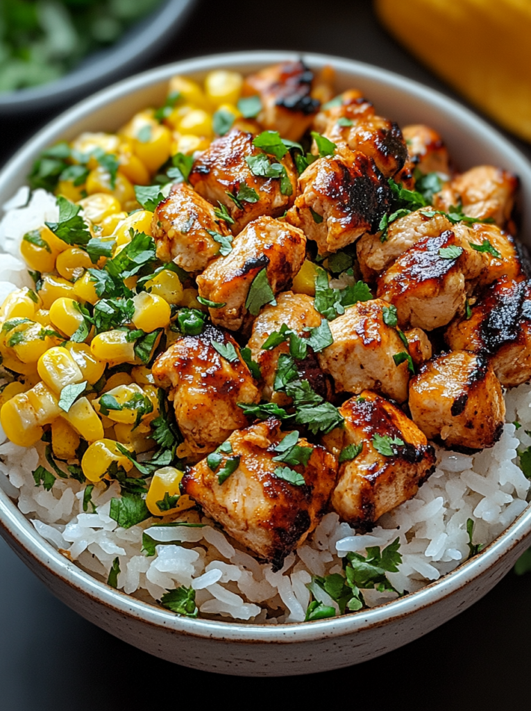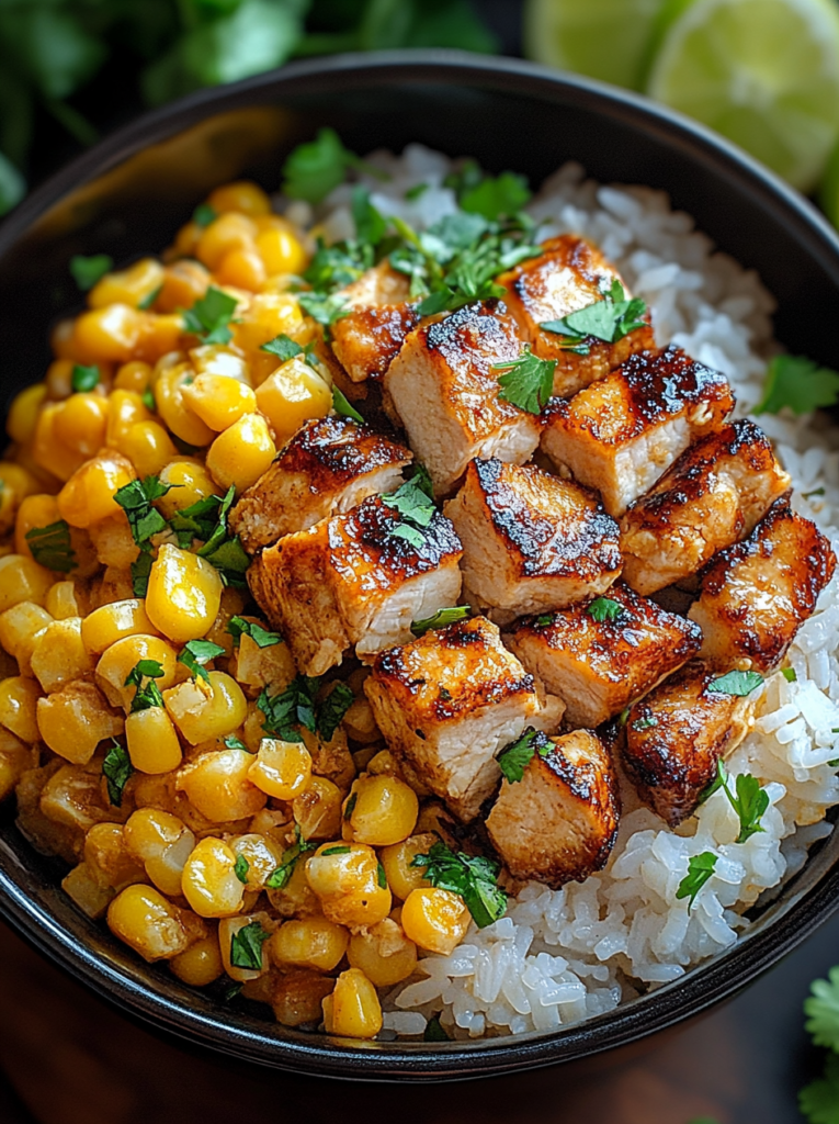 - Assemble the bowls: Add rice as the base, top with chicken, grilled corn, and drizzle with the creamy sauce.
